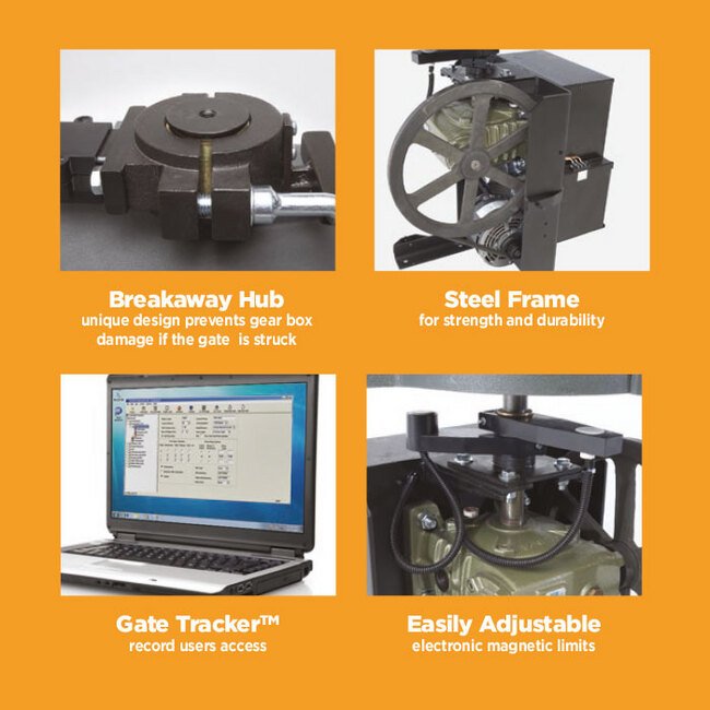 Adjustable, no maintenance magnetic limits.Overlap feature for bi-parting swing gate operation.Simple connection for secondary operator in bi-parting applications.Selectable shadow/reverse loop function.Magnetic lock power provided.Ports for plug-in loop detectors.Three 115 VAC convenience outlets.Gate tracker reporting output.Programming switches.Built-in reset switch.Built-in power On/Off switch.