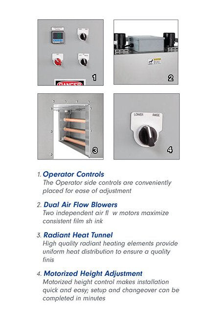 Operator ControlsThe Operator side controls are conveniently placed for ease of adjustmentDual Air Flow BlowersTwo independent air flow motors maximize consistent film shrinkRadiant Heat TunnelHigh quality radiant heating elements provide uniform heat distribution to ensure a quality finishMotorized Height AdjustmentMotorized height control makes installation quick and easy; setup and changeover can be completed in minutes