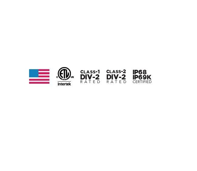 Class 1, Division 2 Groups A, B, C, D, and Class 2, Division 2 Groups E, F, & G | ETL Listed | IP68/IP69K system | NEMA 4X Rated | NEMA 6P Rated