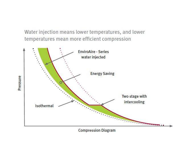 A Superior ChoiceThe EnviroAire's unique water-injected, variable speed design achieves lower speeds combined with lower operating temperatures - resulting in high efficiency and reduced component wear.Water injected into the compression element provides lubrication, sealing and cooling.The superior cooling properties of water allow the compressor to operate at a low temperature providing near isothermal compression, low power consumption and class leading efficiency levels.A reverse osmosis membrane cartridge filters the injection water entering the compressor; as a result the water is always maintained at a high purity level.