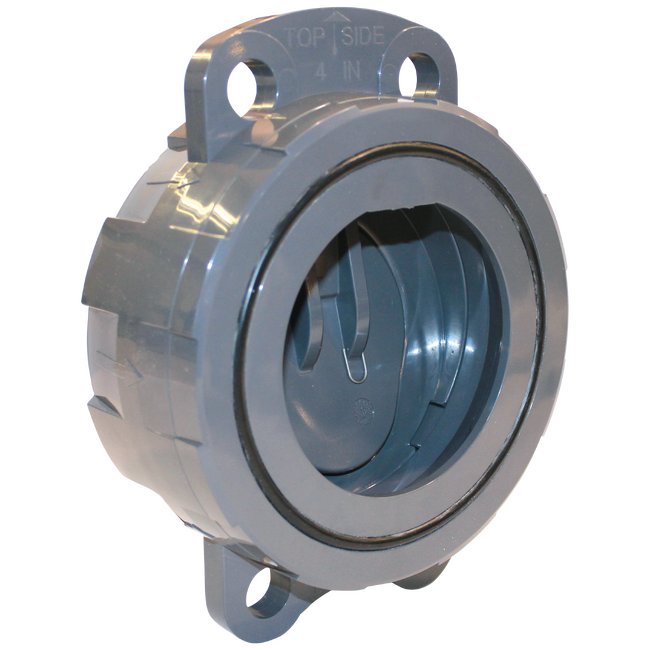 Robust Wide Pattern Body in PVC â No Need for Spacers or specialty flanges. One-Piece Disc and Shaft Design Designed for ANSI150 and PN10 Flanges High Cv Rating Equal to Metal Check Valves Lower Closing Pressure Than Swing Check Valves Integral Bolt Eyes for Ease of Installation for Large Sizes Can be Installed in Vertical or Horizontal Position FPM or EPDM Gasket and Face Seal Pressure Rated to 150 PSI / PN10 In All Sizes