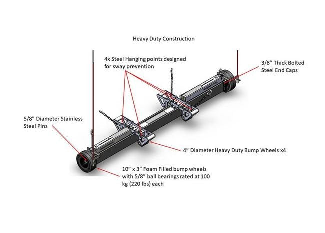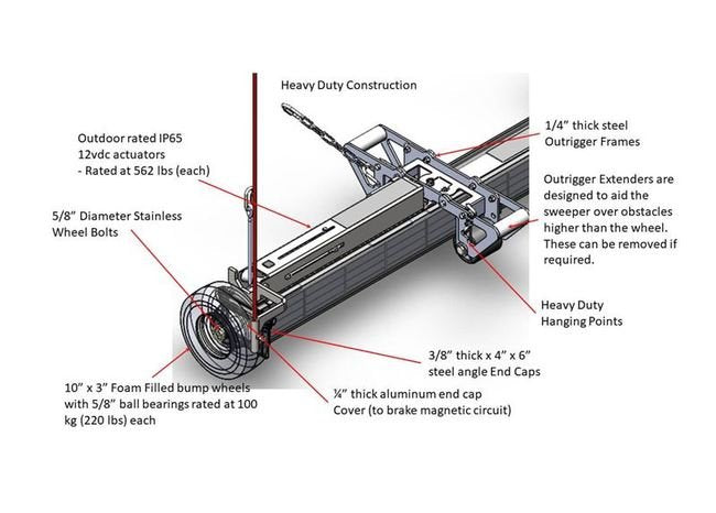 Permanently Charged Grade C8 Magnet.Durable and Protective PVC Quick Clean Off Sleeve.Rugged Durability and Construction.Available in 2 Different Sweeping Widths of 86 and 98 Inches.Wrap Around Feature to Hold onto Debris in Off Road Conditions.Comes With 4 Stabilizing Chains.Flat Proof 10" x 3" Tires with 5/8" Ball Bearings, Each with a 100 kg (220 lb) Rating.Replacement Quick Clean Off Sleeves and all Parts Can be Ordered on this Website if Needed.