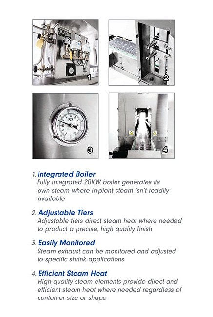 The WSN-GEN S is designed for simple setup where in-plant steam generation isn't readily available. Equipped with 2 adjustable tier manifolds, The GEN S directs the steam heat where needed to produce a precise, high quality finished appearance of PVC, PETG, OPS, and PLA labels and neck bands. The GEN S provides better contour than radiant heat and ensures a quality finish regardless of container size or shape.
