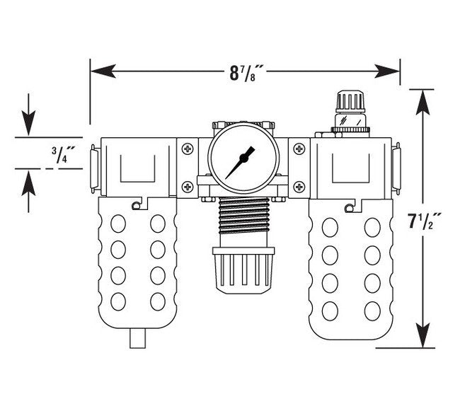 Any of four separate Tri-Star ports permit instant pipe sizing of every Tri-Star filter, regulator and lubricator. Available in 1/4", 3/8", 1/2" , and 3/4" pipe sizes for inlets and outlet ports. Zinc die case metal. A special Tri-Star locking design prev