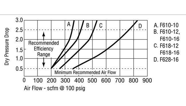 F4 oil removing filters offer general industrial filtration with low pressure drop and long element life. They are often used with older compressors where downstream oil carryover is excessive and when longer element life and low pressure drop are a concern.F5 coalescing filters are used for high filtration of oil aerosols and sub micron particles. They are often used with critical instrumentation; paint spraying equipment; more sophisticated air systems; blow molding bottling; in the food industry, and where air blows on a finished product. The 0.01 micron grade "A" element is offered for the most critical filtration applications, such as those found in clean rooms.F6 adsorber filters were engineered specifically for critical applications that will not tolerate the presence of oil vapors. If the compressed air has been prepared by a suitable refrigerated dryer and F5 oil removing filter, the F6 Adsorber will insure oil concentrations of 0.01 PPM by weight. In all cases, an F5A coalescing filter must precede an F6 Adsorber filter. To prevent any particle migration downstream, an F3 with 3 micron element should be installed downstream for total system protection.
