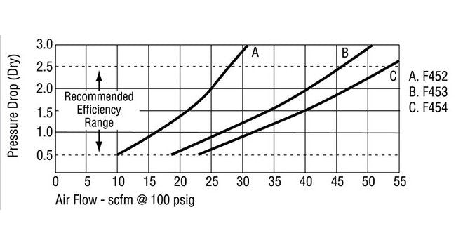 F4 oil removing filters offer general industrial filtration with low pressure drop and long element life. They are often used with older compressors where downstream oil carryover is excessive and when longer element life and low pressure drop are a concern.F5 coalescing filters are used for high filtration of oil aerosols and sub micron particles. They are often used with critical instrumentation; paint spraying equipment; more sophisticated air systems; blow molding bottling; in the food industry, and where air blows on a finished product. The 0.01 micron grade "A" element is offered for the most critical filtration applications, such as those found in clean rooms.F6 adsorber filters were engineered specifically for critical applications that will not tolerate the presence of oil vapors. If the compressed air has been prepared by a suitable refrigerated dryer and F5 oil removing filter, the F6 Adsorber will insure oil concentrations of 0.01 PPM by weight. In all cases, an F5A coalescing filter must precede an F6 Adsorber filter. To prevent any particle migration downstream, an F3 with 3 micron element should be installed downstream for total system protection.