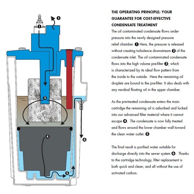 The Operating Principle: Your Guarantee For Cost-effective Condensate TreatmentThe oil contaminated condensate flows under pressure into the newly designed pressure relief chamber. Here, the pressure is released without creating turbulence downstream of the condensate inlet. The oil contaminated condensate flows into the high volume pre-filter, which is characterized by its ideal flow pattern from the inside to the outside. Here the remaining oil droplets are bound to the pre-filter. It also deals with any residual floating oil in the upper chamber.As the pre-treated condensate enters the main cartridge the remaining oil is adsorbed and locked into our advanced filter material where it cannot escape. The condensate is now fully treated and flows around the lower chamber wall toward the clean water outlet.The final result is purified water suitable for discharge directly into the sewer system. Thanks to the cartridge technology, filter replacement is both quick and clean; and all without the use of activated carbon.