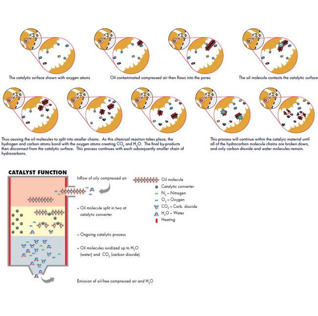 This calls for a fresh approach and advanced solutions. Beko's catalyst technology sets a new benchmark in compressed air treatment products that overcomes these limitations by offering users a technology that will produce what is in essence oil-free air from a single device, regardless of operating conditions.Intensive research and development work was conducted in order to exploit the theoretical possibilities of catalyst technology, which has resulted in the BEKOKAT - a device that combines superior efficiency with the highest level of reliability.The BEKOKAT represents a real technological breakthrough never before offered.