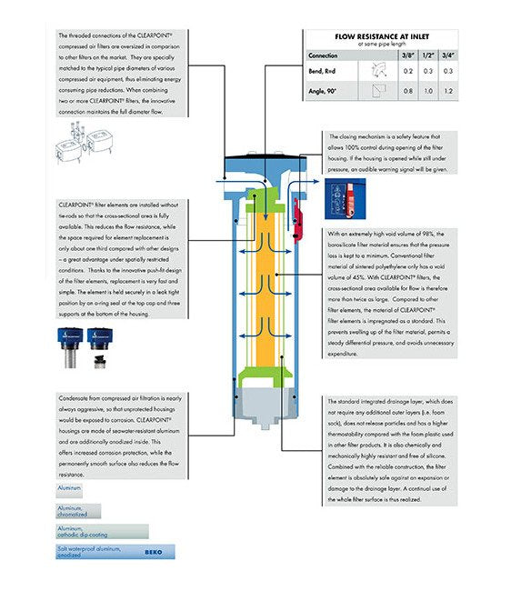 The threaded connections of the Clearpoint compressed air filters are oversized in comparison to other filters on the market. They are specially matched to the typical pipe diameters of various compressed air equipment, thus eliminating energy consuming pipe reductions. When combining two or more Clearpoint filters, the innovative connection maintains the full diameter flow.Clearpoint filter elements are installed without tie-rods so that the cross-sectional area is fully available. This reduces the flow resistance, while the space required for element replacement is only about one third compared with other designs- a great advantage under spatially restricted conditions. Thanks to the innovative push-fit design of the filter elements, replacement is very fast and simple. The element is held securely in a leak tight position by an o-ring seal at the top cap and three supports at the bottom of the housing.Condensate from compressed air filtration is nearly always aggressive, so that unprotected housings would be exposed to corrosion. Clearpoint housings are made of seawater-resistant aluminum and are additionally anodized inside. This offers increased corrosion protection, while the permanently smooth surface also reduces the flow resistance.AluminumAluminum, chromatizedAluminum, cathodic dip-coatingSalt waterproof aluminum, anodizedThe closing mechanism is a safety feature that allows 100% control during opening of the filter housing. If the housing is opened while still under pressure, an audible warning signal will be given.With an extremely high void volume of 98%, the borosilicate filter material ensures that the pressure loss is kept to a minimum. Conventional filter material of sintered polyethylene only has a void volume of 45%. With Clearpoint filters, the cross-sectional area available for flow is therefore more than twice as large. Compared to other filter elements, the material of Clearpoint filter elements is impregnated as a standard. This prevents swelling up of the filter material, permits a steady differential pressure, and avoids unnecessary expenditure.The standard integrated drainage layer, which does not require any additional outer layers (i.e. foam sock), does not release particles and has a higher thermostability compared with the foam plastic used in other filter products. It is also chemically and mechanically highly resistant and free of silicone. Combined with the reliable construction, the filter element is absolutely safe against an expansion or damage to the drainage layer. A continual use of the whole filter surface is thus realized.