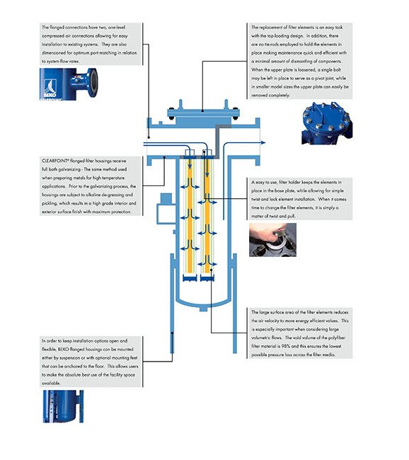 The flanged connections have two, one-level compressed air connections allowing for easy installation to existing systems. They are also dimensioned for optimum port matching in relation to system flow rates.Clearpoint flanged filter housings receive full bath galvanizing - The same method used when preparing metals for high temperature applications. Prior to the galvanizing process, the housings are subject to alkaline de-greasing and pickling, which results in a high grade interior and exterior surface finish with maximum protection.In order to keep installation options open and flexible, Beko flanged housings can be mounted either by suspension or with optional mounting feet that can be anchored to the floor. This allows users to make the absolute best use of the facility space available.The replacement of filter elements is an easy task with the top-loading design. In addition, there are no tie-rods employed to hold the elements in place making maintenance quick and efficient with a minimal amount of dismantling of components. When the upper plate is loosened, a single bolt may be left in place to serve as a pivot joint, while in smaller model sizes the upper plate can easily be removed completely.A easy to use, filter holder keeps the elements in place in the base plate, while allowing for simple twist and lock element installation. When it comes time to change the filter elements, it is simply a matter of twist and pull.The large surface area of the filter elements reduces the air velocity to more energy efficient values. This is especially important when considering large volumetric flows. The void volume of the polyfiber filter material is 98% and this ensures the lowest possible pressure loss across the filter media.