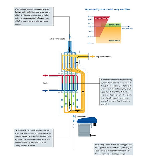 Warm, moisture saturated compressed air enters the dryer and is cooled down to a temperature of +35-41 ºF. The generous dimensions of the heat exchanger promote especially effective cooling, while flow resistance is reduced to an absolute minimum.The dried, cold compressed air is then re-heated in an air-to-air heat exchanger before reaching the outlet and going downstream from the dryer. During this process, the relative humidity of the air is lowered considerably and up to 60% of the cooling energy is recovered.Contrary to conventional refrigerant drying systems, the air follows a downward path through the heat exchanger. The force of gravity results in a particularly high droplet separation of almost 99%. Within the oversized collection area, the flow velocity is greatly reduced, so the carryover of previously separated droplets is reliably prevented.Any resulting condensate from the cooling process is discharged from the Drypoint® RA unit through the electronic level controlled BEKOMAT® condensate drain in order to maximize energy savings.