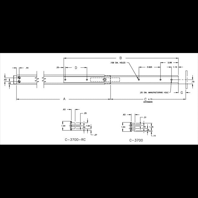Right hand and left hand slide are same.Finish: All Standard Slides are coated with Poxylube® dry film lubricant.All standard slides are designed to lock in the extended position.Automatic release is available if lock-out is not desirable.Standard hardware packages include all hardware necessary to mount Chassis Trak® slides:C-3700 Rear mounting brackets (B-217)Bar nuts (CA8056-06-0017)#6;-32 x 0.38 B.H.M.S.#6;-32 KEPS® nuts#10;-32 x 0.50 F.H.M.S.#10;-32 x 0.38 B.H.M.S.#10;-32 KEPS® nutsC-3700-RCRear mounting brackets (B-161)Bar nuts (CA8056-06-0014)#6;-32 x 0.38 B.H.M.S.#6;-32 KEPS® nuts#10;-32 x 0.50 F.H.M.S.#10;-32 x 0.38 B.H.M.S.#10;-32 KEPS® nutsAll sliding members of this slide are made from cold rolled steel.All Chassis Trak® solid bearing slides are supplied with a quick disconnect feature. This permits the entire chassis to be removed easily and replaced.Optional mounting patterns, slide lengths and extensions are available.