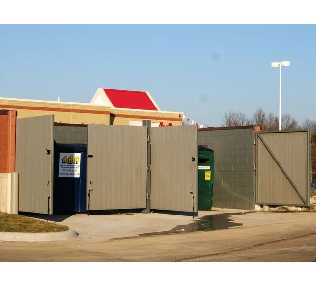 Durable vinyl enclosure gate for commercial utility units. Enhance aesthetics and minimize maintenance. Ideal for waste receptacles, transformers, and more.