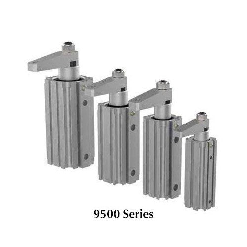 The Destaco Pneumatic Right Hand Swing Clamp from the 9500 Series offers unparalleled flexibility and enhanced mounting options, featuring a unique design that allows the clamp arm to swing 90° on a horizontal plane before moving downward on its clamping stroke. With a height of 6.54 inches and a sturdy base width of 1.81 inches, this clamp provides a secure hold with a clamp force of 76 lb at 87 PSI pressure. The shielded piston rod protects against weld spatter, ensuring durability and longevity. Ideal for industrial applications requiring precision and reliability.
