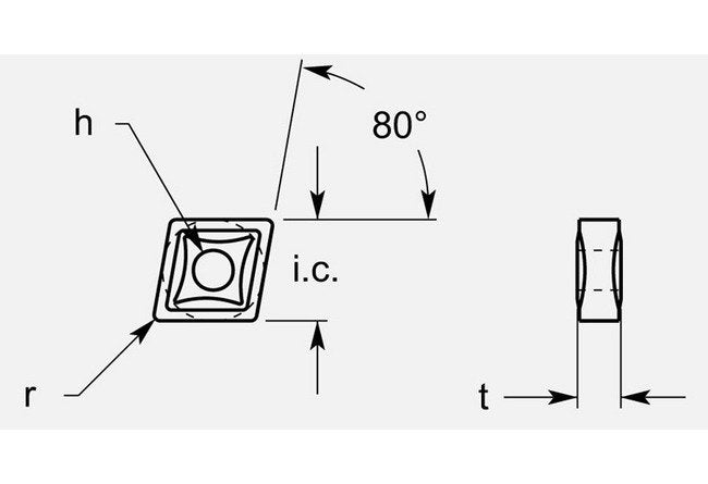 Enhance turning performance with our Utility Diamond Negative GP1 Chipbreaker featuring a precise thickness of 0.259/0.265 inches and an inscribed circle of 0.622/0.628 inches. Operating at 80 degrees, and with a hole diameter of 0.247/0.253 inches, this chipbreaker is ideal for General Purpose use. Available grades provide flexibility to meet specific requirements upon request.