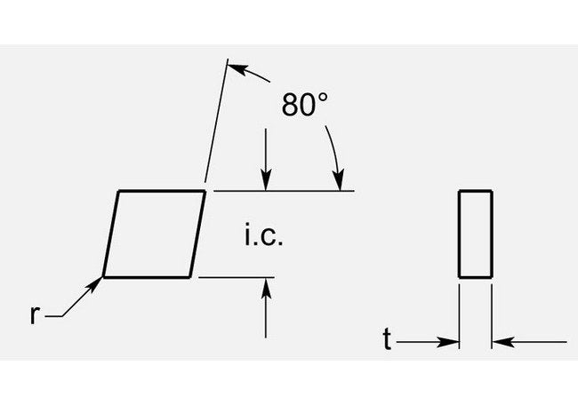The Diamond Negative turning blank is a precision-engineered tool for turning applications, featuring a thickness of 0.135 / 0.143 inches. Crafted with meticulous dimensional specifications including an inscribed circle of 0.639/0.645 inches and an 80-degree angle, this turning blank ensures high performance and reliability. Ideal for both consumer and institutional needs, it is classified as 'IN STOCK' for immediate availability. Grade availability can be customized to meet specific requirements upon request.