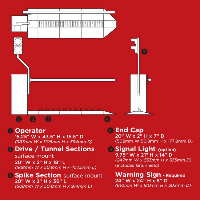 1/2 HP continuous-duty motor.115 VAC, 60 Hz, 5.4A, 230 VAC, 60 Hz, 2.7A, 460 VAC, 60 Hz, 1.4A (230 and 460 volt units use a step-down power transformer to achieve 115 volt operating voltage.)40:1 gearbox running in a continuous oil bath.Arm rotates 90º in approximately 2.5 seconds.Class II, III and IV applications.Dimensions: 15.25 "W x 43.5 "H x 15.5 "D.Magnetic Electronic Limit ControlsAuto-Close timer 1-23 secondsP.A.M.S. (Perimeter Access Management System) sequence with a Slide or Swing Gate OperatorUp Input Memory BufferDown Memory OptionMultiple Up CommandsPort for plug-in Open (Up) DetectorPort for plug-in Reverse (Down) DetectorProgramming SwitchesBuilt-in Power On/Off SwitchDKS Pedestrian Protection System: The system reverses Barrier Arm if person is detected, and lowers Barrier Arm if unauthorized vehicle enters. Requires DKS 9411 Loop Detector and a photo-beam.Compliant with UL 325 and 991. (Note: To be compliant with UL 325 and industry safety guidelines, entrapment protection devices need to be installed with this gate operator. Your professional DKS system installer can provide you with more details on these devices and on current industry safety standards.)Spike ComponentsMaximum 20,000 Lb. per axle weight limit.Tunnel sections surface mount: 31 "W x 3 "H x 24 or 36 "LSpike sections surface mount: 31 "W x 3 "H x 36"LEnd Cap: 31 "W x 3 "H x 12.25 "L