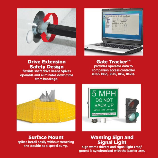 For more secure locations our customers choose the 1620 Surface Mount Lane Barrier or Spring Loaded Auto Spikes for greater control without trenching. Lane breach deterrence is best achieved with mechanically-linked Surface Mount Auto Spikes, or the Steel Rotating Lane Barrier provide a more formidable perimeter, complete with required warning signs and signal lights. The optional Backup Battery means no property will be out of commission in the event of a power outage.A host of experience-born features ensure DKS products serve all types of locations, from industrial and commercial properties, gated communities, residence halls and apartment complexes, retail parking, rental car garages, self storage facilities, schools, government agencies and more. The DKS Pedestrian Protection System reduces liability by watching out for people in the path of the arm while the Reversible Edge Vehicle Awareness Sensor prevents damage when vehicles havenât cleared the flow point. Mountable on the left or right, DKS Traffic control products also offer Back Up Detection, Perimeter Access Management to sequence with Swing and Slide Gate Operators, and of course, Gate Tracker Reporting to know about the who, where, when of traffic traveling in and out of the property. With all the features to keep you moving forward, it's DKS.A typical system will require the 1603 Operator, a Drive Extension, Tunnel Section(s) as needed, Spike Section(s) as needed, and an end cap. A Traffic Signal and/or Warning Sign is required with this system. Contact your professional DKS system installer, or DoorKing® directly, for more information on complete system requirements.CAUTION: not to be used in areas subject to freezing weather with the potential for snow and ice accumulation. Maximum 20,000 Lb. per axle weight limit on spike sections.FOR A HIGHER DEGREE OF TRAFFIC CONTROLThe DKS 1603 Barrier Gate Operator Automated Spike System is designed as a modular system, allowing for easy flexibility in different applications and easy installation. The 1603 Operator is designed with many advanced features and mechanically links the Spikes to the Barrier Arm. Ideal for parking lots, rental car agencies, schools, car dealerships, government agencies, or in any application where a higher degree of traffic control is preferred.