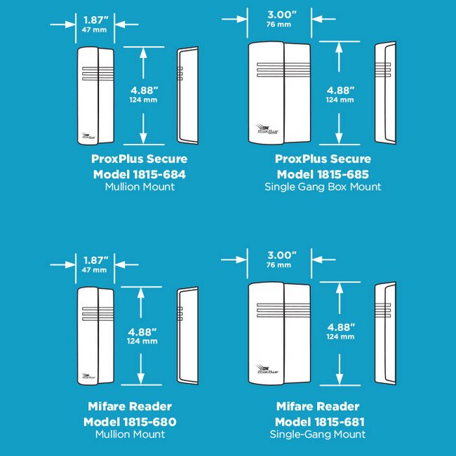 DK ProxPlus Secure Card Readers1815-684 mullion mount.1815-685 single-gang electrical box mount.Card touch required for activation.Reads only DK ProxPlus Secure cards.Output from reader is 26-bit Wiegand format.These readers offer an extremely high level of security.Cards are encrypted with additional coding making them almost impossible to duplicate.