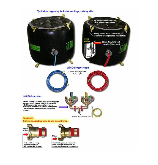 All controllers are fitted with the over-pressure safety relief valve. Medium pressure heavy lifting air bags can be inserted under objects with as little as 2" (50mm) clearance. Capacities up to 26,000 Lbs (11,902 kg). Use for heavy load lifting, shifting, leveling or as padded supports.Made of Kevlar® reinforced NR = Isoprene rubber, natural. SBR = Styrene-butadiene rubber. (NR-SBR) rubber compound.