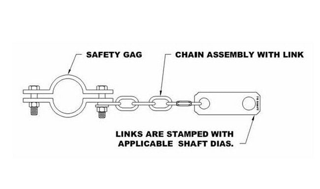 Warning: These are general instructions only. Please refer to the appropriate operating procedures for the test plug being utilized. The 147 Series Test Plugs are designed to be self-sealing and self-gripping, which facilitate both the seal and the gripper to become tighter as pressure increases. The extra squeeze of the seal and gripper caused by the test pressure can be detected as minor movement of the shaft. Installing the Safety Gag with a tight chain may limit or prevent the small movement of the test plug shaft as pressure is increasing, and subsequently limit or prevent the self-sealing and self-gripping feature of our test plugs. The amount of slack in the chain as well as the position of the installed plug should be observed from a safe distance to insure no appreciable movement of the plug has occurred. Should movement be noted, the test should be stopped and all pressure released immediately.Install Safety Gag pipe clamp onto pipe being tested. Safety gags are to be installed with some slack so that movement of the shaft is not prohibited as pressure increases during testing.Tighten bolts to insure slippage will not occur.Insert test plug into tube or pipe. Follow appropriate operating procedures for the plugs being utilized, and install plugs per recommended torque values using a calibrated torque wrench.Prior to pressurizing the system, slip the link over the shaft end. Safety gags 8" and larger are equipped with two chain and link assemblies. The links are stamped with the shaft sizes they can accommodate. Each link can do at least two sizes of shafts. Insure you have the appropriate link set-up before using. Unscrew the chain connector and switch the link around if necessary.Continue with appropriate operating procedures.