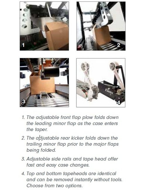 The adjustable front flap plow folds down the leading minor flap as the case enters the taper.The adjustable rear kicker folds down the trailing minor flap prior to the major flaps being folded.Adjustable side rails and tape head offer fast and easy case changes.Top and bottom tape heads are identical and can be removed instantly without tools. Choose from two options.
