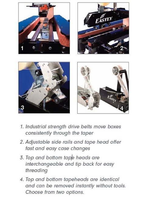Industrial strength drive belts move boxes consistently through the taperAdjustable side rails and tape head offer fast and easy case changesTop and bottom tape heads are interchangeable and tip back for easy threadingTop and bottom tape heads are identical and can be removed instantly without tools. Choose from two options.