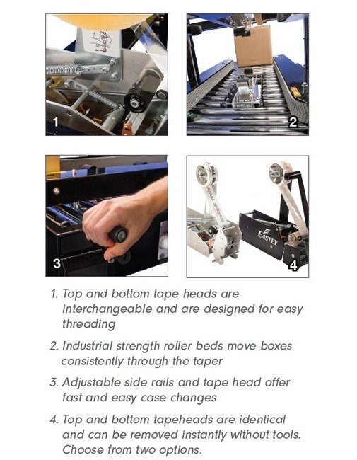 Top and bottom tape heads are interchangeable and are designed for easy threadingIndustrial strength roller beds move boxes consistently through the taperAdjustable side rails and tape head offer fast and easy case changesTop and bottom tape heads are identical and can be removed instantly without tools. Choose from two options.