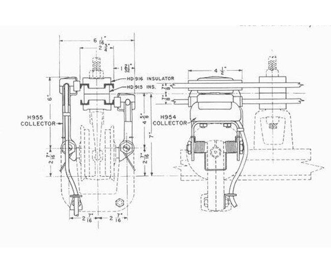 Collectors may be mounted on all standard United States Monorail trolleys except light duty trolleys. Each yoke will accommodate two collectors. Each collector is mounted at the top of the trolley yoke to assure accurate relation to the conductor bar when trolley passes around curves.