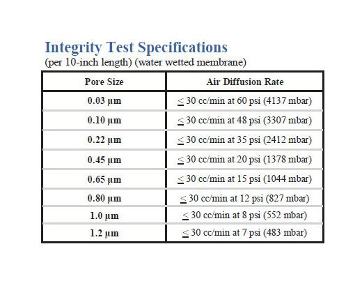EPS grade cartridges are validated using modified HIMA protocols at a challenge level of 106 organisms per cm2 of filter media. (0.22 µm challenged with Brevundimonas diminuta) (0.45 µm challenged with Serratia marscecens) (0.65 µm challenged with Saccharomyces cerevisiae).