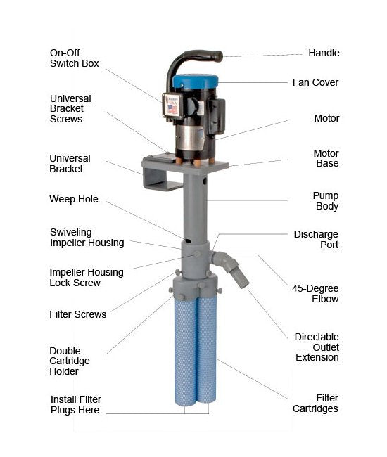 Running Pump Dry Does Not Damage Motor, Pump, Seals or BearingsThe Nut-Style Filter Holder allows you to change filter cartridges without loosening the Filter Screws on the Flo King pump. Just unscrew Threaded Nut from bottom of Stem, remove old cartridge, install new cartridge, tighten Nut and resume filtration.