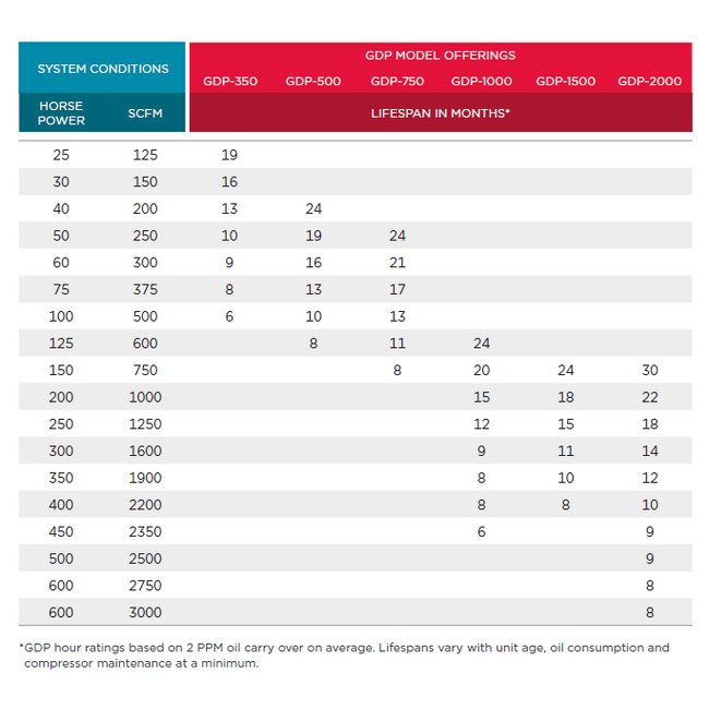 GD PAKs, when properly sized and installed, are guaranteed to reduce the contaminants in your compressor condensate to less than 10 ppm for the life of the unit. In the event a unit fails while operating in approved conditions and having been properly sized and installed, Gardner Denver™ will replace the failed GD PAK or provide a refund through your authorized Gardner Denver™ distributor.