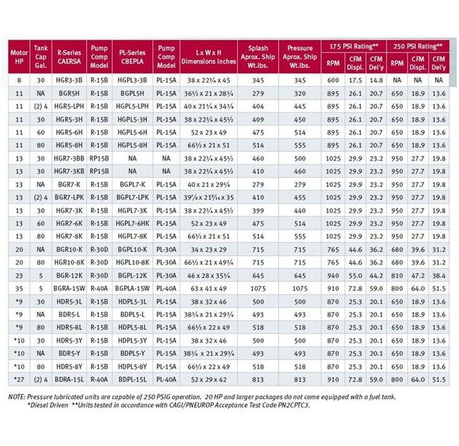 Proven Design Today’s Gardner Denver Reciprocating Compressors are the product of decades of design and development. In fact, we introduced the first single-stage compressor in 1919 and have continuously improved its design through innovations in material, production techniques and quality control. Proven Dependability You rely on compressed air to perform many tasks efficiently. Gardner Denver knows that reliability is one of the main reasons for a purchase. Our slow speed, built-in efficiency through design, and the longest compressor warranty in the industry make Gardner Denver compressors the proven choice! High Performance R & PL-Series compressors are loaded with features designed for day-in, day-out performance. For example, Gardner Denver’s unique automotive-type domed piston design allows the use of large diameter, low lift valves, while minimizing clearance volume for maximum air delivery. Long Life Features such as slow speed operation, rugged cast iron crankcase construction, corrosion resistant steel valves and tapered roller-type main bearings, all contribute to long life. User-Friendly Design A wide selection of configurations and available options, coupled with serviceability features, make it easy to operate and maintain a Gardner Denver compressor. Compare all the features on the pages that follow. You’ll discover why Gardner Denver is the value leader in reciprocating compressors for a broad range of automotive and industrial applications. Select The Configuration That Matches Your Application With many models from which to choose in both single-stage and two-stage compressors, we can match your exact needs. These configurations, combined with a wide choice of options, provide all the components for a customized installation. They are available in both R-Series splash-lubricated and PL-Series pressure-lubricated models. Tank-Mounted Air Compressors Available with horizontal or space-saving vertical tanks. Two stage air compressors compress air to a higher pressure than single-stage compressors. Base-Mounted Air Compressors Designed for installations where air tanks are remotely located. Duplex Air Compressors For extra air delivery when you need it without wasted space. Plus the flexibility of single operation, alternating between compressors, or duplex operation to meet high air demand. Gasoline or Diesel Engine Powered Air Compressors Truck and utility bed mounting design makes these compressors ideal for fleet and field service. Ideal for applications where electricity is not available. Bare Compressor Pumps Gardner Denver pumps provide dependable service for industrial applications, OEM applications, and pump replacement. The rugged pump design assures reliability and long maintenance intervals. Receivers Receivers are ASME approved and include a pressure gauge, pressure relief valve, drain valve and service valve.