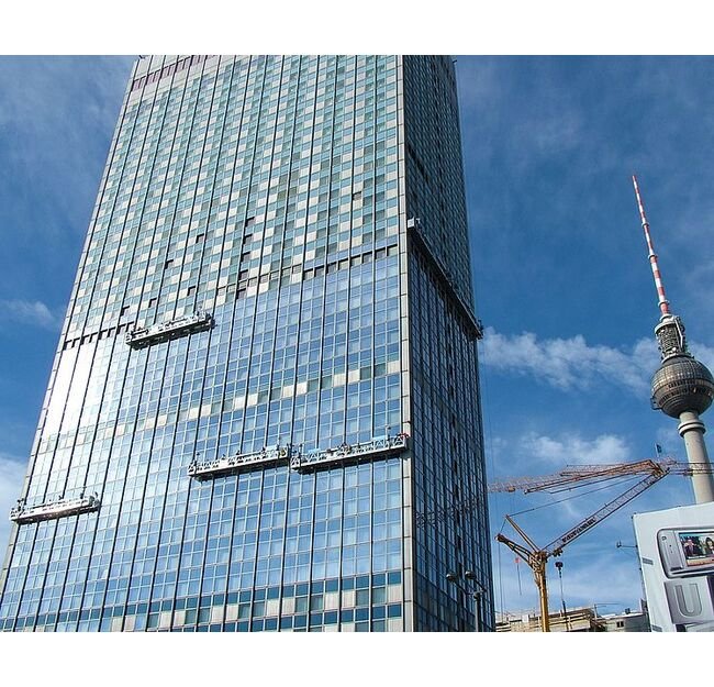 With the rope suspended working platforms from GEDA, you can work on building façades, but also on silos, towers, cooling towers, industrial plants, pits, etc. without a scaffold.The platform offers enough space for people and materials. You can exactly adjust the working height of the platform to the centimeter, which always grants ergonomic posture.The hot-dip galvanized outriggers on the roof are easily installed and removed because of their plug connections. The components are very lightweight and can be transported by one person. This facilitates moving the platform.