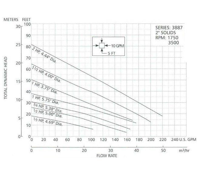 The Goulds Submersible Sewage Pump is engineered for efficient sewage handling with a maximum solids handling capacity of 2 inches. Delivering up to 185 GPM and total heads of up to 38 feet TDH, this pump ensures reliable performance. The 2" NPT threaded companion flange comes standard, with a 3" option available for separate orders (Order no. A1-3). Operating temperatures range from 104°F continuous to 140°F intermittent, making it versatile for various applications. Crafted from durable cast iron by Goulds Pumps, this submersible pump is a robust solution for sewage management.