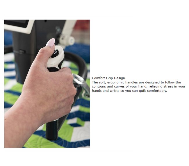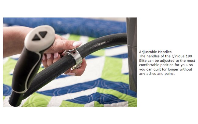Designed to Feel FamiliarMaking the leap to a longarm machine can be intimidating, but the Q'nique 19X Elite makes it easy! This machine is lightweight and easily maneuverable compared to other longarms.Extended Quilting Area19 inches of throat space lets you quilt much bigger, more intricate quilt blocks and finish quilts faster.Bigger, Better Touchscreen Display7" full-color display provides a variety of highly accessible tools and options at your fingertips, including on-screen help guides and instructions.Elite TechnologyDiscover innovative smart technology like a patented edge warning system to keep you inside your quilting area, or a bobbin estimator feature that tells you how much longer your bobbin will last.Perfect for Detailed StitchworkWith a speed of up to 2,600 stitches-per-minute and built-in stitch regulation, you can quilt at any speed knowing that your stitches will be beautifully consistent.Adjustable HandlesThe handles of the Q'nique 19X Elite can be adjusted to the most comfortable position for you, so you can quilt for longer without any aches and pains.Comfort Grip DesignThe soft, ergonomic handles are designed to follow the contours and curves of your hand, relieving stress in your hands and wrists so you can quilt comfortably.4 Quick-Access ButtonsThere are two buttons on each handle with user-friendly labels: start/stop the machine, adjust needle position up/down, and speed up/slow down the machine.Adjustable Hopping FootThe hopping foot can be rotated to give you the best view of your stitching.Built-in automatic bobbin winderUnlike other long and midarm machines, the 19X Elite has a built-in bobbin winder to wind your large M Style bobbins quickly. The machine's bobbin cam is set so the bobbin will wind completely before the winder shuts off. Since the bobbin winder works independently of the machine, you can wind your bobbin while you're quilting. For best results when winding a bobbin, Grace recommends 50 weight polyester thread on a cone.Edge WarningThe edge warning alert system helps you stay within a “safe area” of your quilt by notifying you when you approach the edge of a set boundary. This will help prevent the machine from hitting the rails of the frame, but you can also set boundaries around a particular block or section of the quilt. Please note the Edge Warning is automatically deactivated in baste mode, so the alarm will not bother you while tacking down your quilt.