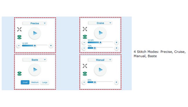 Precise - In the default precise mode, you select the stitch length you want and the machine will adjust to help make more consistent stitches. It only stitches when you move the machine, which aids with patterns that have corners or crisp points.Cruise - Cruise mode is helpful for continuous, smooth, or curvy designs. It does the same as precise mode, except the machine will continue to stitch in place (at the minimum speed) if you stop moving the machine.Manual - Manual mode makes the machine produce stitches at a certain speed. It's up to the quilter to move the machine the distance needed to get the desired stitch length. This mode is helpful for small, continuous patterns.Baste - Use baste mode to create loose, temporary stitches around the edge of your quilt top to hold layers of fabric together while quilting.