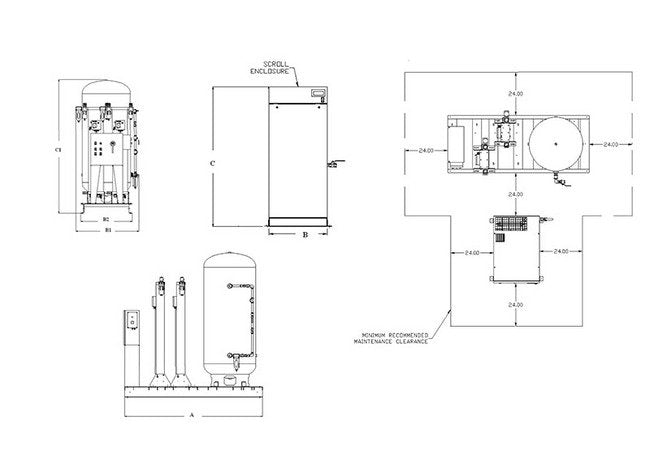 Each system is completely tested before shipment and includes: Multiple oil-less scroll air compressors and associated equipment Corrosion resistant air receiver Desiccant air dryers with purge control Control panel Dew point monitor System installation requirements:1. Main power connection to master control panel2. Interconnecting power wiring between master panel, each compressor unit, and tank/dryer skid3. Control signal wiring between master panel and each compressor unit4. Remote inlet air connection to each module - minimum 1.5" NPTF5. Interconnecting plumbing connections between each compressor and tank/dryer skid