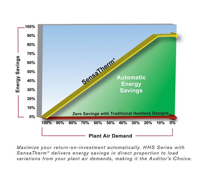 Hankison®'s HHS Series with patented SensaTherm® automatically matches purge air to plant air demand. This ensures maximum performance as the saved energy goes right to your bottom line.When operating at reduced capacity, the on-line drying tower remains active longer, until its full drying capacity is utilized. Desiccant bed temperature changes are constantly monitored within each tower to precisely manage drying times and reduce purge air consumption.SensaTherm® also measures the increase in desiccant bed temperature (heat of adsorption) during the drying stage and the decrease in desiccant bed temperature (heat of desorption) during the regeneration stage. These temperature changes are accurate indicators of the moisture load on the dryer. This data is interpreted by microprocessor based controls to determine how long a tower stays on-line during the drying stage.