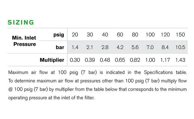 Low pressure drop: 0.5 to 1 psi (0.03 to 0.07 bar) - Typical coalescing filters operate at 3 to 6 psi (0.21 to 0.41 bar) requiring the air compressor to operate at higher operating pressures, increasing power requirements by 2.5% or moreWith a large in-depth bed, element life is much longer than conventional oil removal filtersVirtually maintenance free