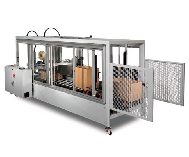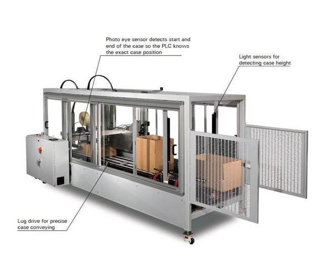 Custom engineered to meet your exacting specifications including variations in case size, weight and operator orientation provides you maximum efficiency.Allen Bradley PLC analyzes sensor input and controls sequence and timing for 3-stage operation of indexing, folding and sealing and controls function of each stage allowing for high speed production.Electric control panel with main disconnect switch can be mounted on either side for fast access and convenient line configuration.Top flap compression rollers on each side positions and closes flaps before taping for an improved seal.Servo controls provide consistent power for precise positioning and greater response time.3M AccuGlide⢠3 taping heads precisely apply a full range of box sealing tapes in 2" to 3" widths.Sliding access doors with electrical interlocks disconnect power and air for operator safety.Safety access-control panels are made of punched steel allowing operator to observe case flow.