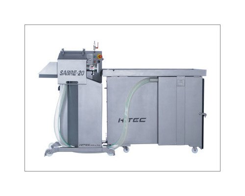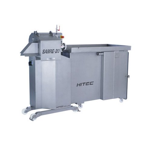 The Hitec 'SABRE-20' High Speed Sausage Peeler revolutionizes peeling processes with a maximum speed of 300m/min, handling sausage products from 13mm to 36mm in diameter. This efficient machine ensures sanitary conditions with angled surfaces, easy maintenance, quick product changeover, and integrated Vacuum Tank unit for peeled casing disposal.