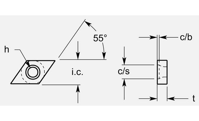 The ISO Diamond Negative with ISO Style Hole turning blank offers a precise thickness range of 0.104 to 0.112 inches, ensuring uniformity in your turning projects. With an Inscribed Circle diameter of 0.264 to 0.270 inches and an optimal Angle of 55°, this blank guarantees accurate and efficient performance. The hole size of 0.107 to 0.113 inches and C/S & CB dimensions of 0.143 to 0.149 inches and 0.036 to 0.042 inches respectively, further enhance its versatility. Grade Availability: In Stock.