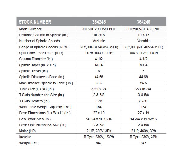 Heavy Duty casted head for more accuracy and rigidityLarge Precision Ground T-slot Production Table for easy set upsLatest AC Inverter Variable Speed TechnologySpindle is supported by high quality ball bearings CSA/CUS: Following strict guidelines and electrical requirements, these JET Drills are CSA/CUS certifiedLED Machine LampSpindle GuardEmergency StopSpindle is supported by high quality ball bearings Variable Spindle Speeds from 65 - 2,000 RPM'sHigh Torque at all speeds both forward and reverseContinuous Speed Adjustment while in operationFront Mounted LED Spindle RPM ReadoutForward and Reverse for TappingFront Mounted Positive Control Depth StopLarge Hand Grips designed with the Users comfort in mind