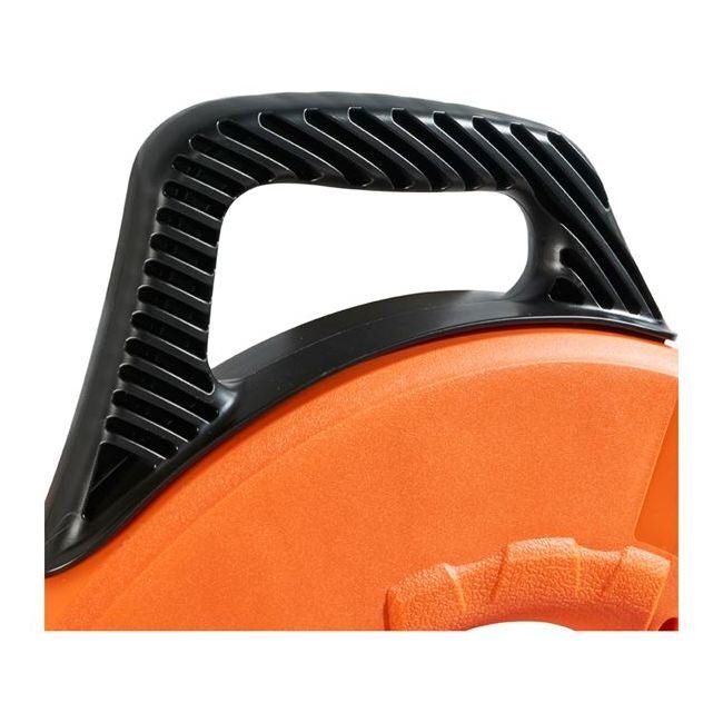 "Permanent, laser etched 1' increments on the tape allow you to more accurately measure the depth of conduit runs and determine the amount of tape left to pay out.""Non-conductive, fiberglass fish tape slides easily over existing wires and through multiple bends.""The lightweight, strong fiberglass tape resists harsh elements and is strength rated up to 500 pulling pounds."The 13'' case diameter means you can reel in 15% more tape in a single revolution vs. a standard 12'' case.Durable 7'' leader helps push through crowded conduit.Raised finger grips help transfer 100% of the winding power from your hand and fingers.Unique sloped handle optimizes the position of your hand for quick hand-over-hand rewinds and allows a more level payout of tape on the backswing while feeding conduit."Repair kit (Cat. No. 56115), replacement eyelets (Cat. No. 56116) and spiral leaders (Cat. No. 56120) available.""Wear approved eye protection when feeding, pulling or rewinding fish tape.""Although fiberglass fish tape itself is non-metallic, its metallic tip and leader are conductive and could be grounded against conduit. Do NOT use on or near live electrical circuits.""Do NOT pull a fiberglass fish tape with any type of mechanical fish-tape puller. A mechanical puller will severely damage the tape, and could lead to personal injury."Do NOT bend a fiberglass fish tape to a radius smaller than 3'' (76 mm) or the tape may break.Never remove screws while fish tape is coiled inside reel.