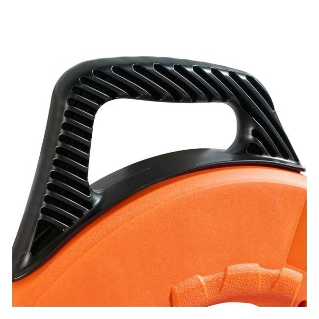 "Permanent, laser etched 1' increments on the tape allow you to more accurately measure the depth of conduit runs and determine the amount of tape left to pay out.""Non-conductive, fiberglass fish tape slides easily over existing wires and through multiple bends."The lightweight and strong fiberglass tape resists harsh elements and is strength rated up to 500 pulling pounds.The 17'' case diameter means you can reel in 10% more tape in a single revolution vs. a 16'' (406 mm) case.Durable 7'' leader helps push through crowded conduit.Raised finger grips help transfer 100% of the winding power from your hand and fingers.The unique sloped handle optimizes the position of your hand for quick hand-over-hand rewinds and allows a more level payout of tape on the backswing while feeding conduit.Made in the USA.Repair kit available (Cat. No. 56115).Replacement eyelets (Cat. No. 56116) and spiral leaders (Cat. No. 56120) available."Wear approved eye protection when feeding, pulling or rewinding fish tape.""Although fiberglass fish tape itself is non-metallic, its metallic tip and leader are conductive and could be grounded against conduit. Do NOT use on or near live electrical circuits.""Do NOT pull a fiberglass fish tape with any type of mechanical fish-tape puller. A mechanical puller will severely damage the tape, and could lead to personal injury."Do NOT bend a fiberglass fish tape to a radius smaller than 3'' (76 mm) or the tape may break.Never remove screws while fish tape is coiled inside reel.