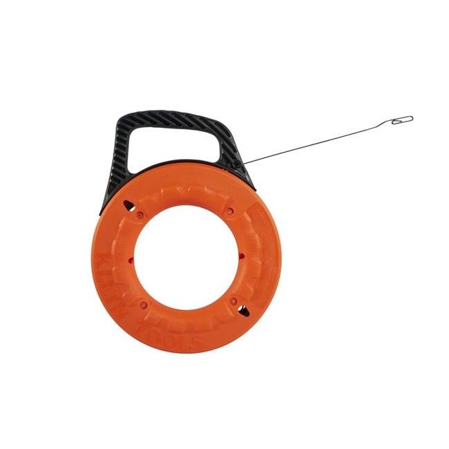 High strength spring steel fish tapes are stiff for long runs and are great for heavy duty wire pulls.Laser etched markings in 1' (0.3 m) increments allow you to more accurately measure the depth of conduit runs and determine the amount of tape left to pay out.Polypropylene case and handle offer the maximum in impact resistance.Raised finger grips transfer 100% of the winding power from your hand and fingers."Full grip style handle gives you a firm, steady grip as you pull tape from the case."Unique sloped handle optimizes hand position for quick hand-over-hand rewinds."Patents: D574,277; 8,212,178; 8,168,921; 8,164,025. Other Patents Pending.""Wear approved eye protection when feeding, pulling or rewinding fish tape."Do NOT use any fish tape on or near live circuits. Use extreme caution when working near any electrical equipment.Use a safe work position to avoid loss of balance when using fish tape.Never form pulling loop into a single loop (into shape of a fish hook) or create a sharp edge that could cause fish tape to catch on other objects or cut into insulation of surrounding wires. Pulling loop should only be formed into a double loop.