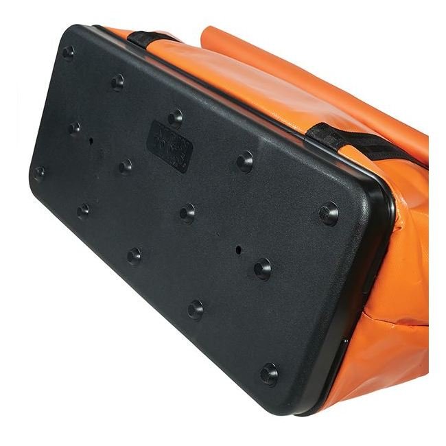 The Klein® Extra-Large Nylon Equipment Bag is a premium solution for safely storing and transporting tools. Crafted from durable orange vinyl-coated nylon fabric, this bag features nylon-web handles for enhanced support and a wide-opening steel frame securely riveted at the top. The added storm flap ensures protection from the elements. Reinforced with metal studs and plywood at the bottom, this bag is built to withstand heavy everyday use. Ideal for aerial hardware tasks, this bag meets stringent institutional procurement standards for quality and durability.
