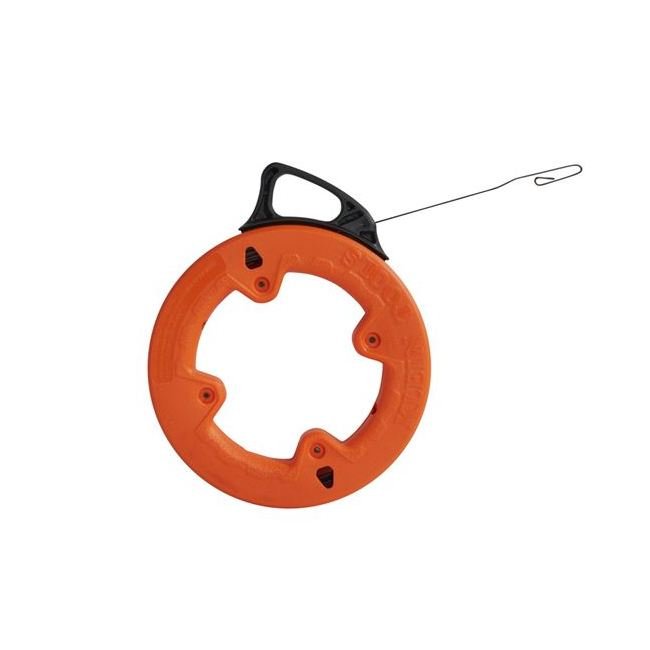 High strength spring steel fish tapes are stiff for long runs and are great for heavy duty wire pulls.Laser etched markings in 1' (0.3 m) increments allow you to more accurately measure the depth of conduit runs and determine the amount of tape left to pay out.Polypropylene case and handle offer the maximum in impact resistance."Full grip-style handle gives you a firm, steady grip as you pull tape from the case."Raised finger grips transfer 100% of the winding power from your hand and fingers.Unique sloped handle optimizes hand position for quick hand-over-hand rewinds."Patents: D574,277; 8,212,178; 8,168,921; 8,164,025. Other Patents Pending.""Wear approved eye protection when feeding, pulling or rewinding fish tape."Do NOT use any fish tape on or near live circuits. Use extreme caution when working near any electrical equipment.Use a safe work position to avoid loss of balance when using fish tape.Never form pulling loop into a single loop (into shape of a fish hook) or create a sharp edge that could cause fish tape to catch on other objects or cut into insulation of surrounding wires. Pulling loop should only be formed into a double loop.