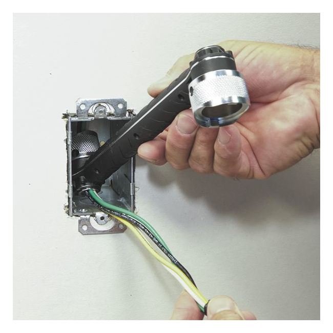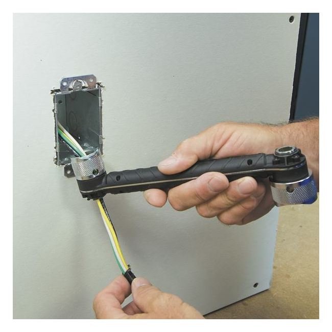 Product of the year 2016 ECM magazine hand tool category.Easily attach locknuts in tight or deep cut-in boxes."For 1/2" and 3/4" connectors."Direct-drive heads rotate each other when twisted.Heavy duty steel construction enables needed torque to loosen or tighten connectors.Perfect for remodel work where box is filled with existing wires.Always ensure that you and the persons in the vicinity wear approved eye protection.Do not use on or near live electrical circuits.Screwdriver Leverage Hole in Head to Provide Extra Torque.